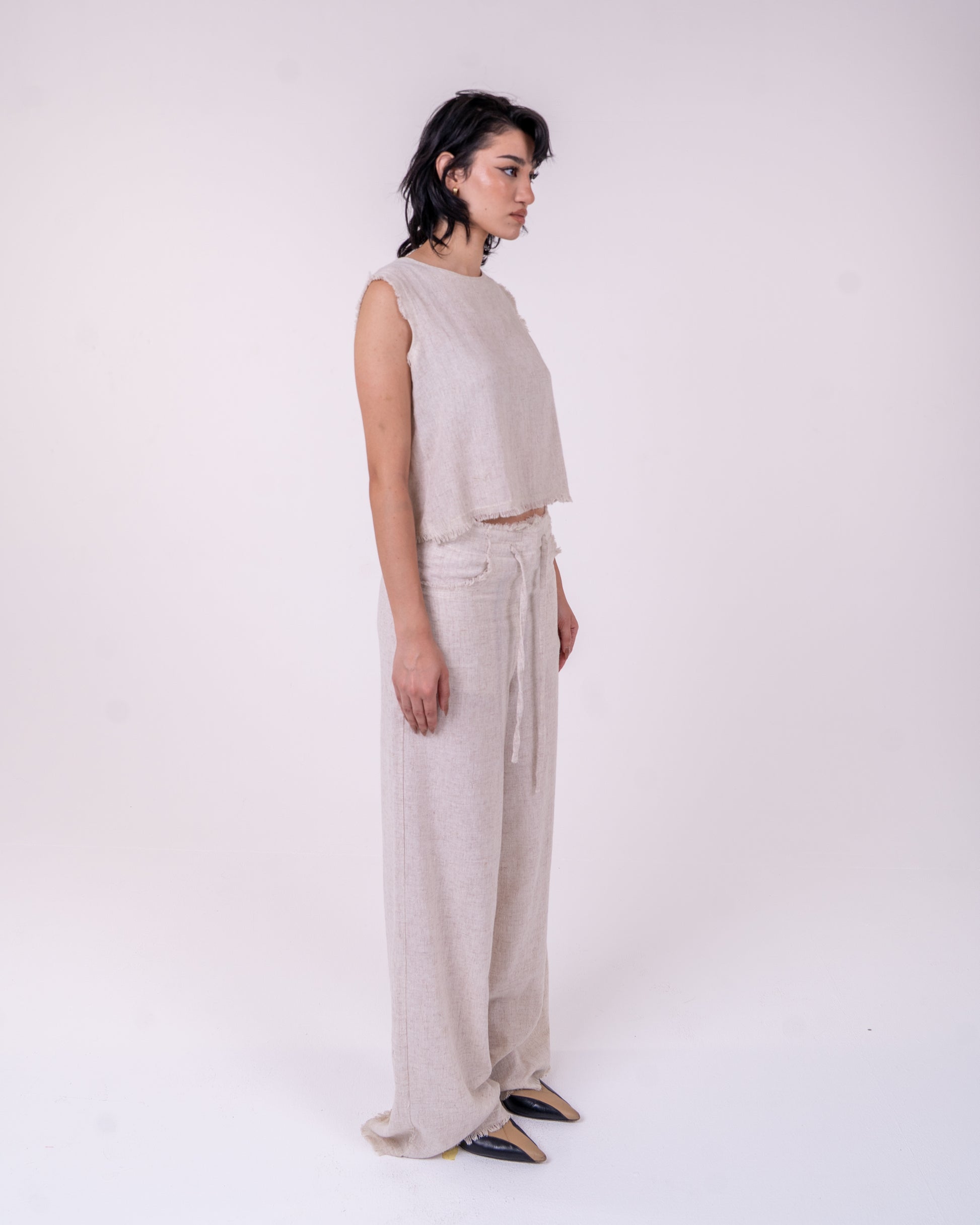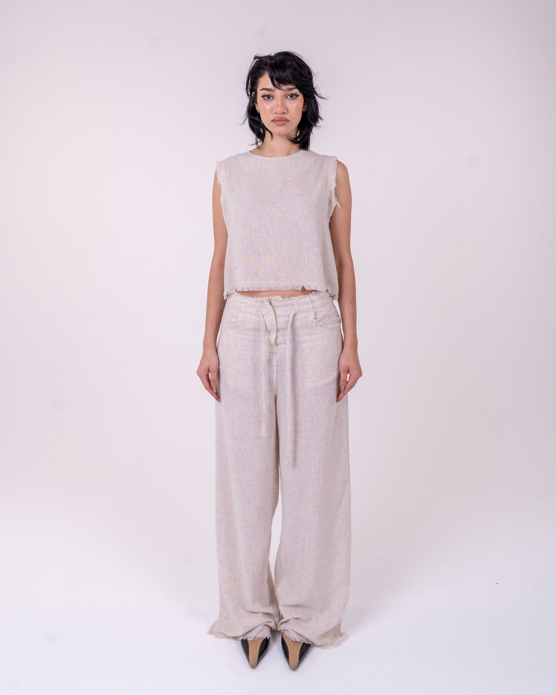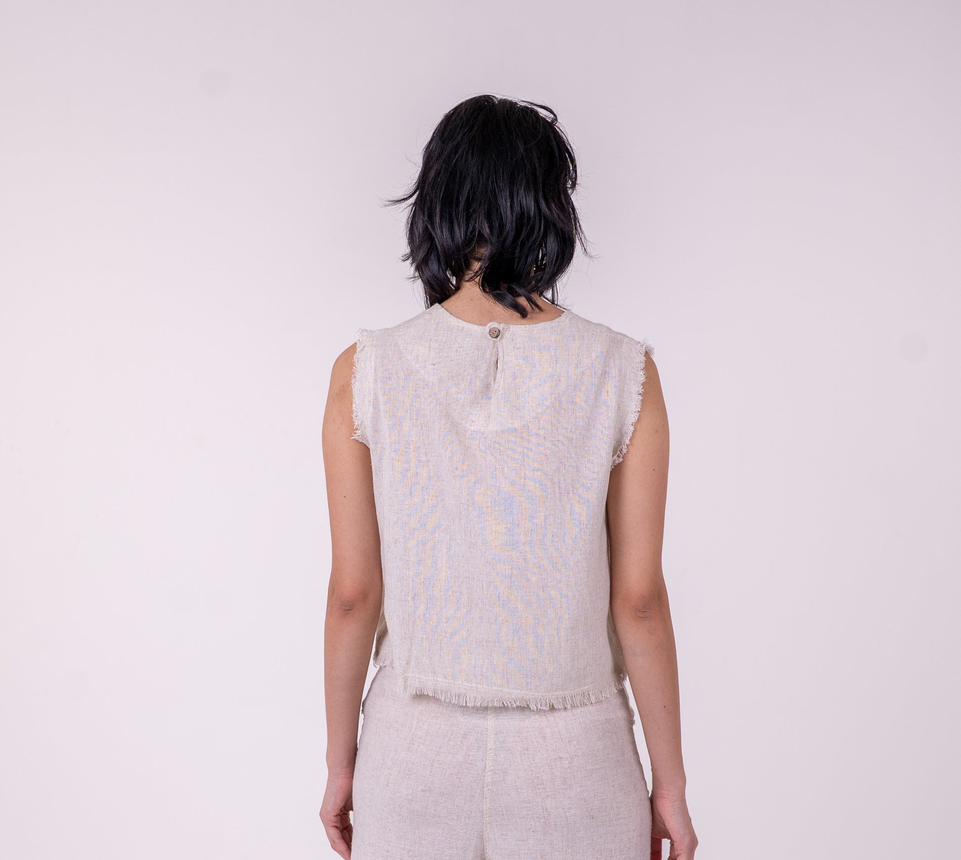 A sleeveless cropped linen top in a soft Beige tone, featuring raw-cut edges for a natural, effortless look. Designed with a relaxed fit and round neckline, this top is perfect for warm days or laid-back styling. Pairs perfectly with matching linen bottoms or your favorite denim.