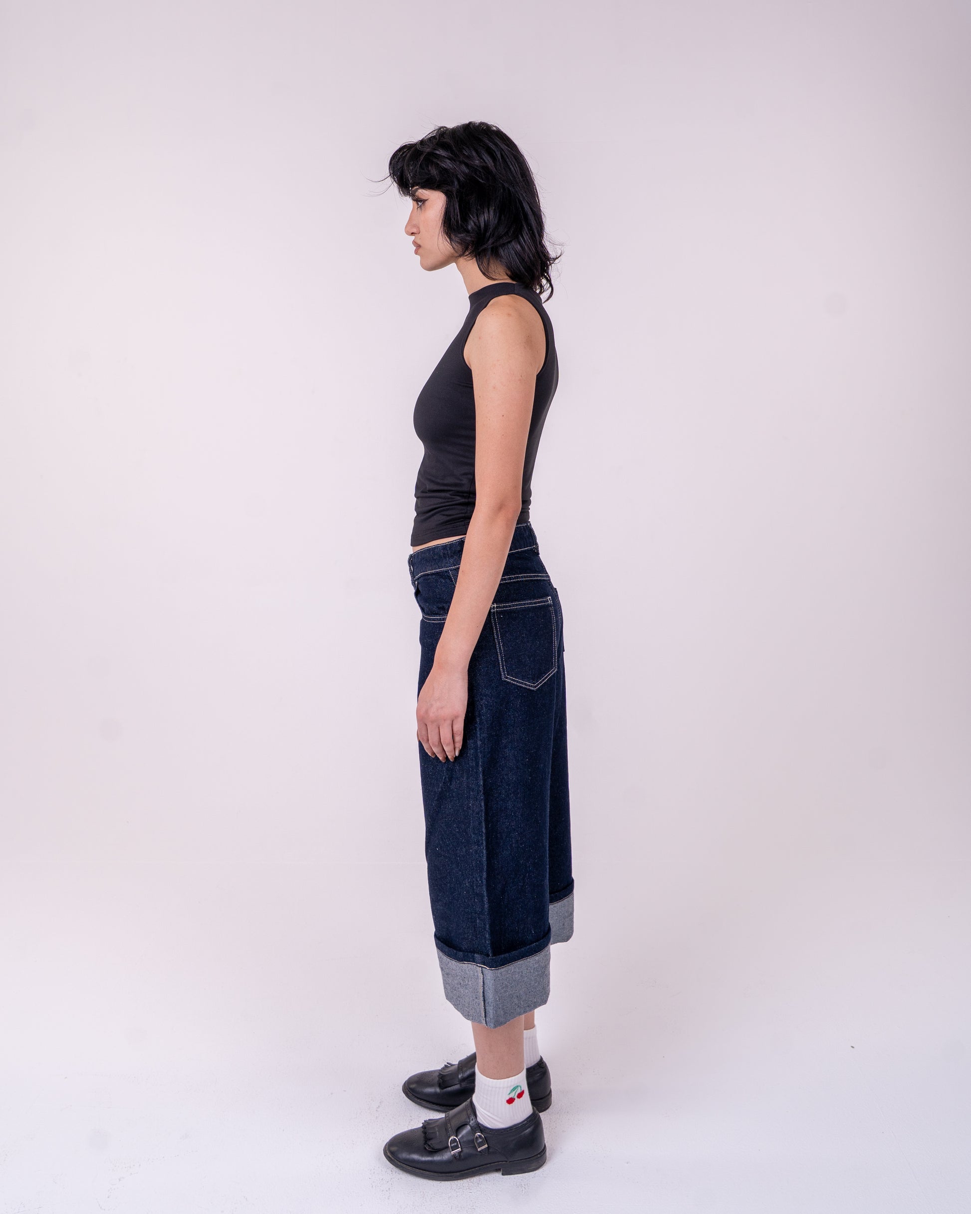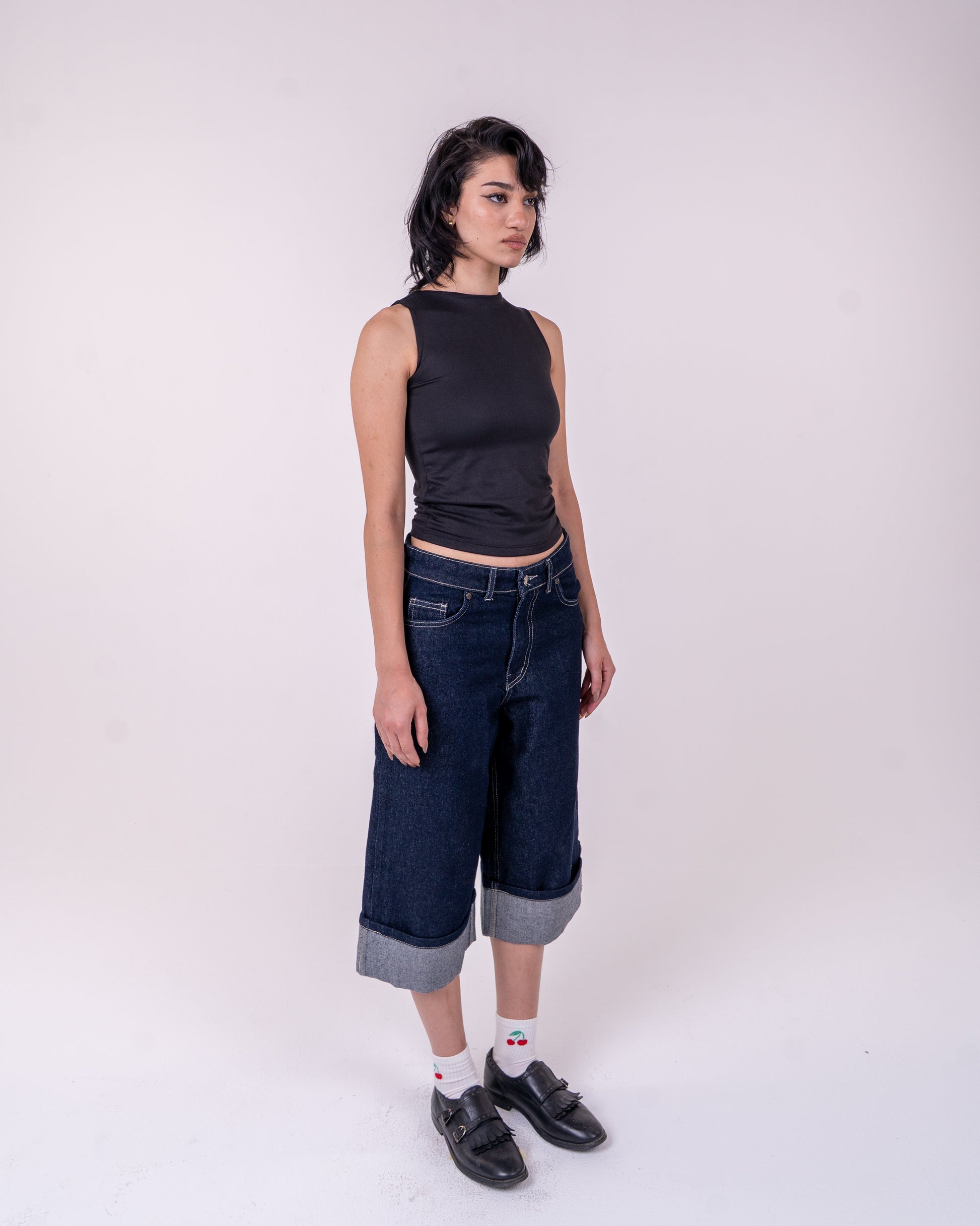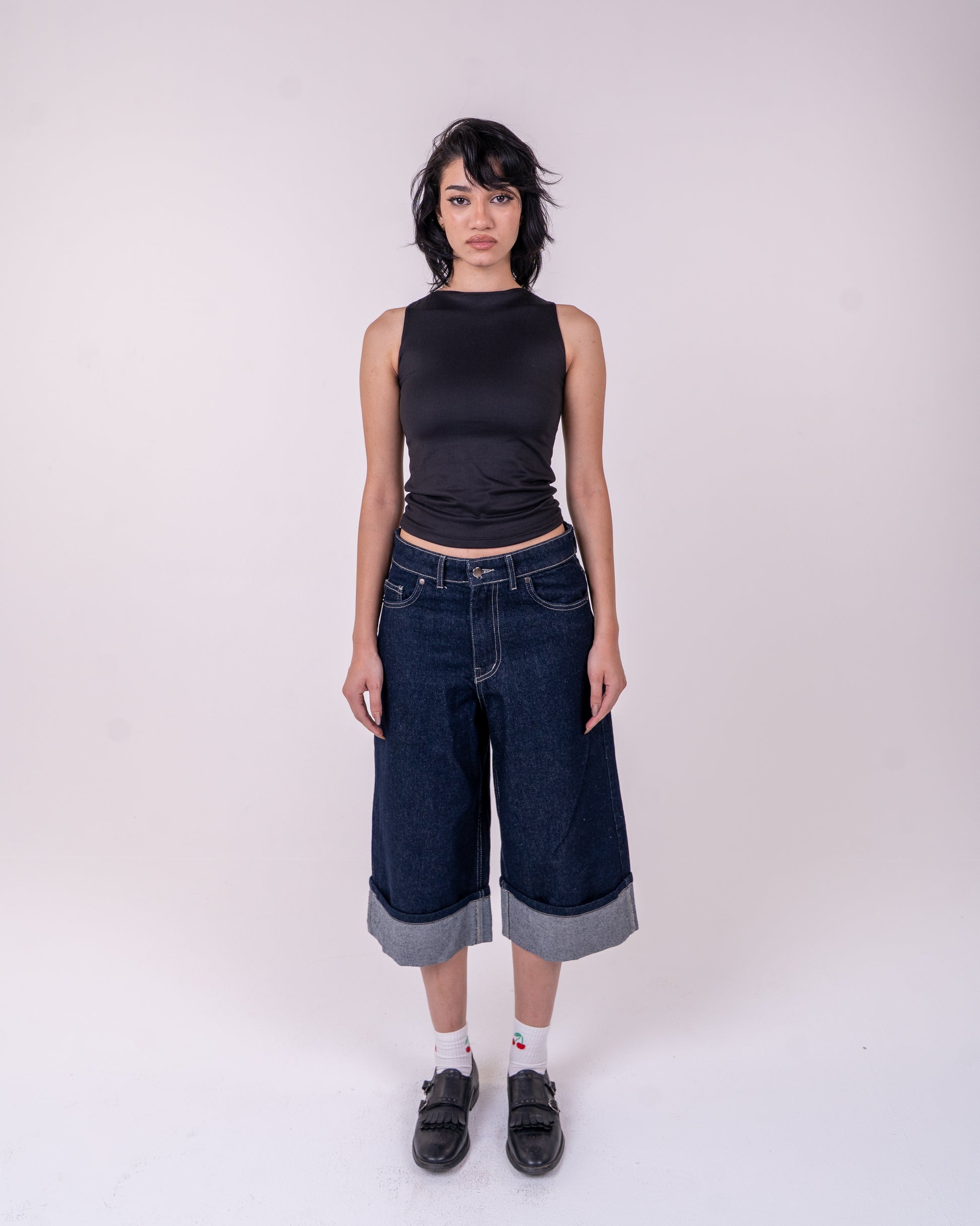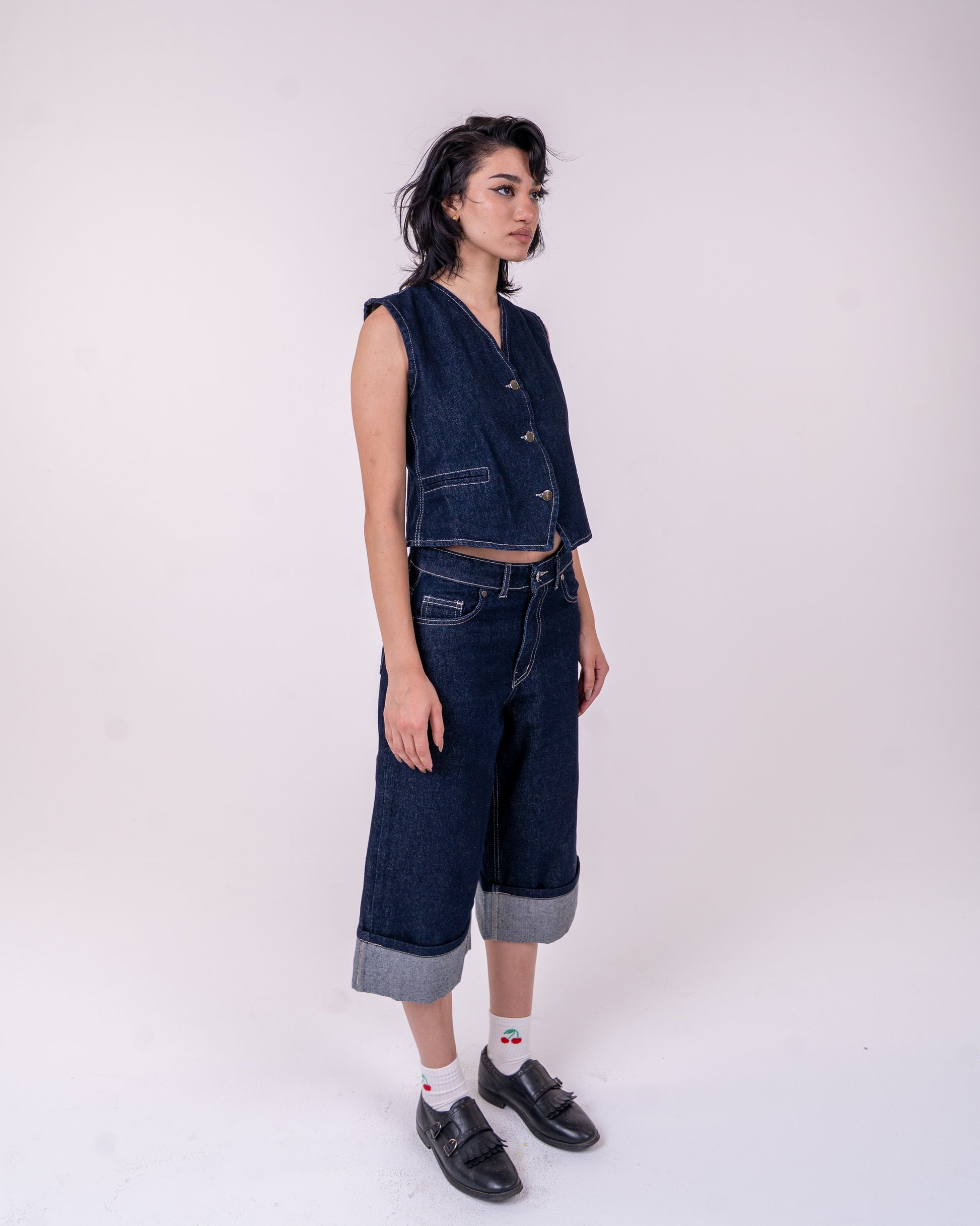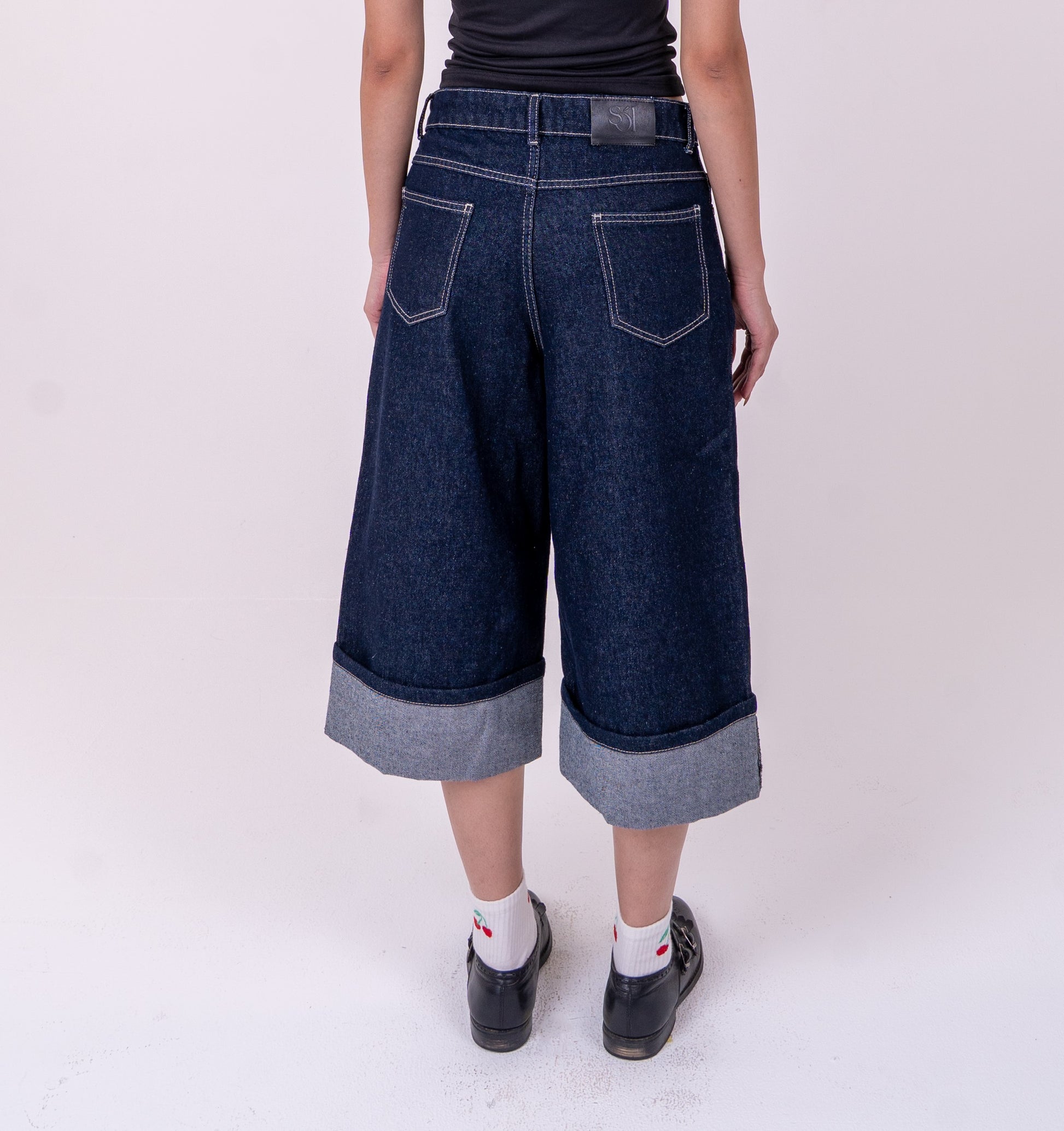 A classic navy blue denim jort with a relaxed fit and folded hem for a laid-back, effortless vibe. Made from durable, mid-weight denim with just the right amount of structure. Perfect for everyday styling with sneakers, sandals, or slides.