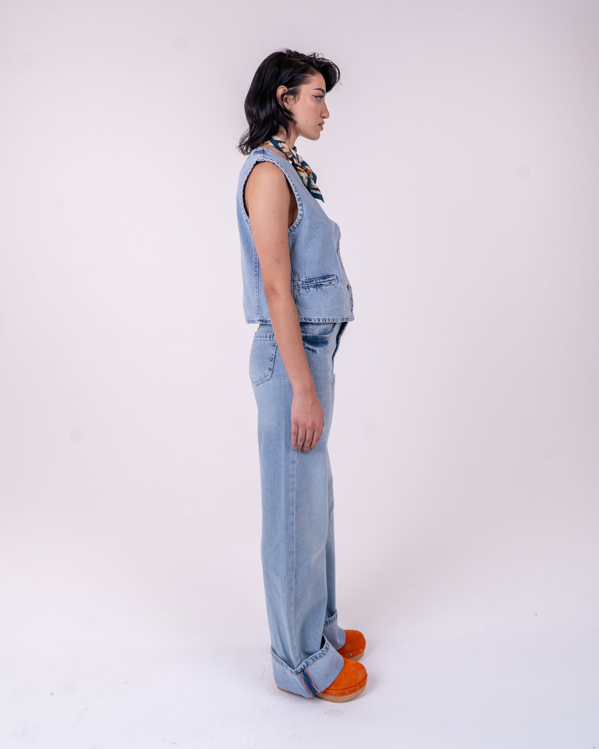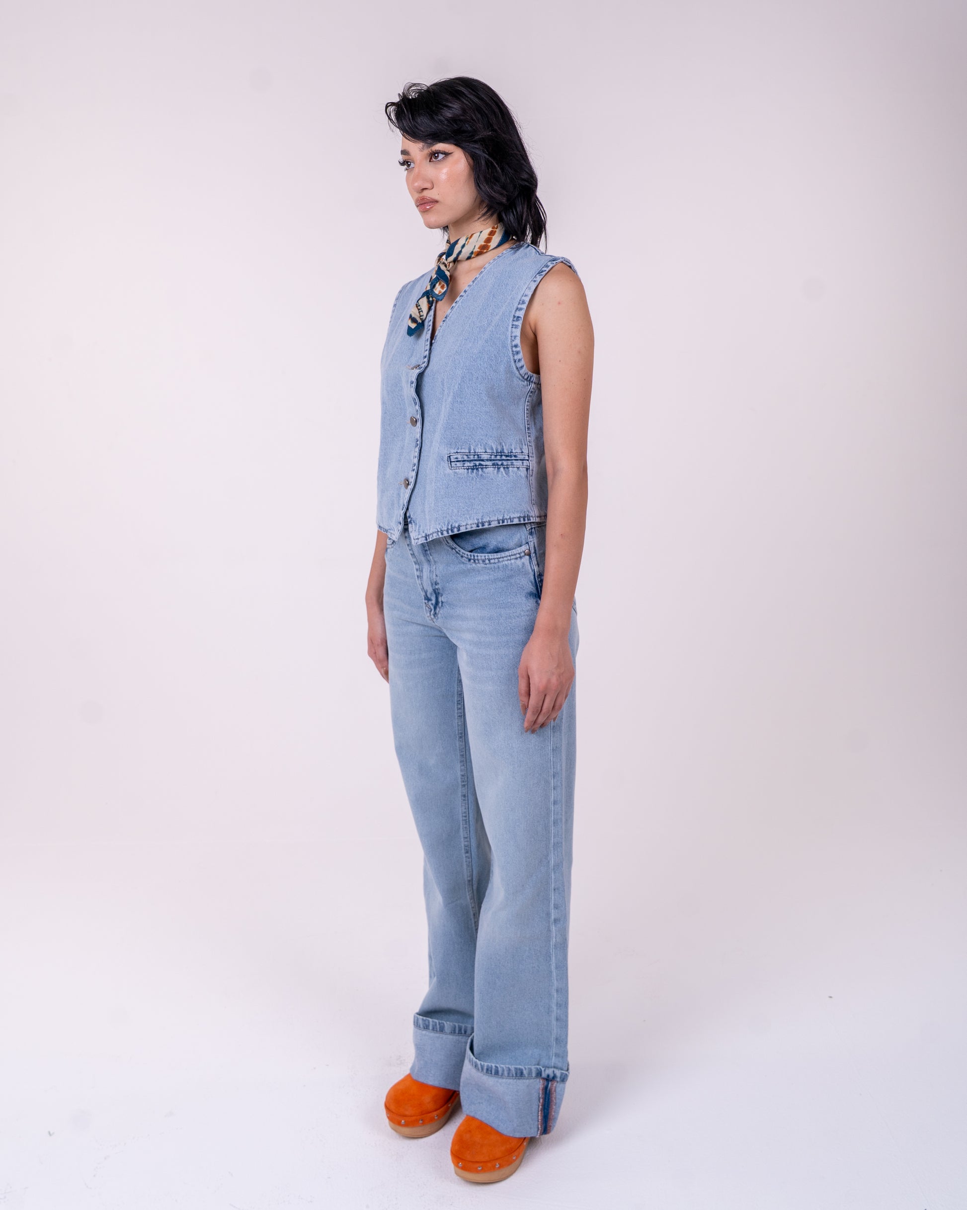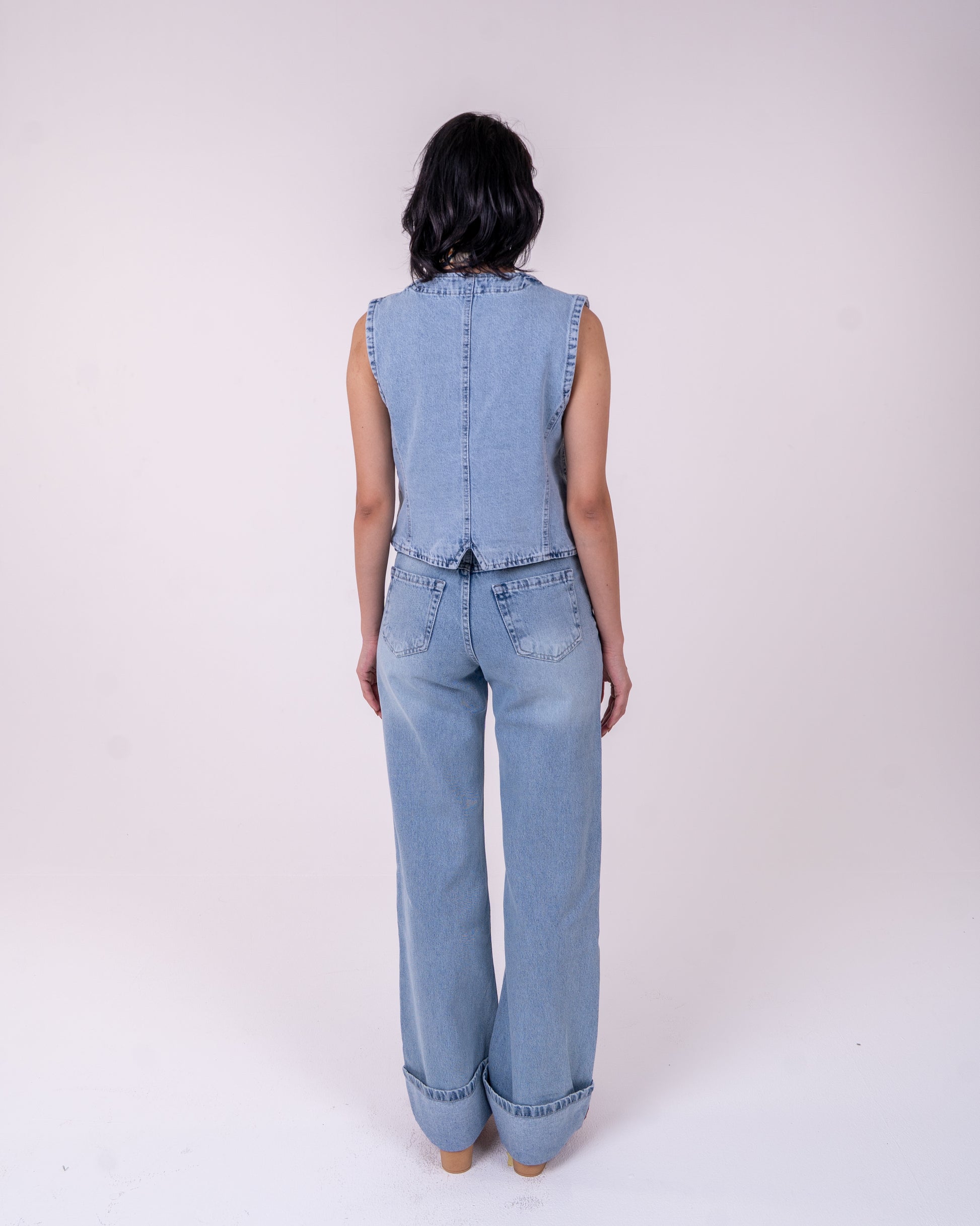 A bold reimagination of classic denim, this Light blue Denim Vest & Wide-Leg Jeans Set blends structure with effortless style. The sleeveless vest features a modern, boxy fit with sharp tailoring, contrast stitching, and front welt pockets for a sleek, minimalist aesthetic. Designed to be worn open or buttoned up, this versatile piece pairs effortlessly with high-waisted denim or layered over a fitted top for a contemporary twist.