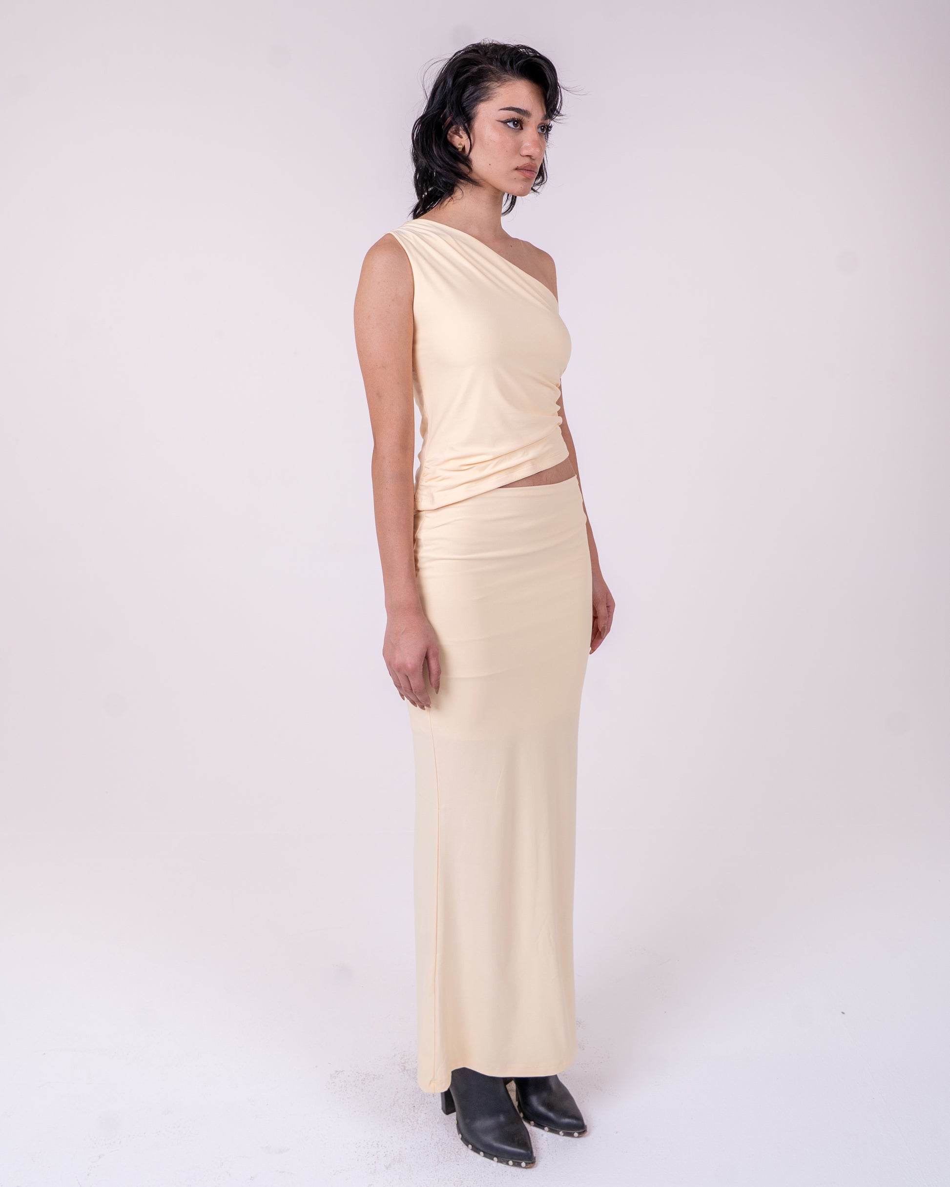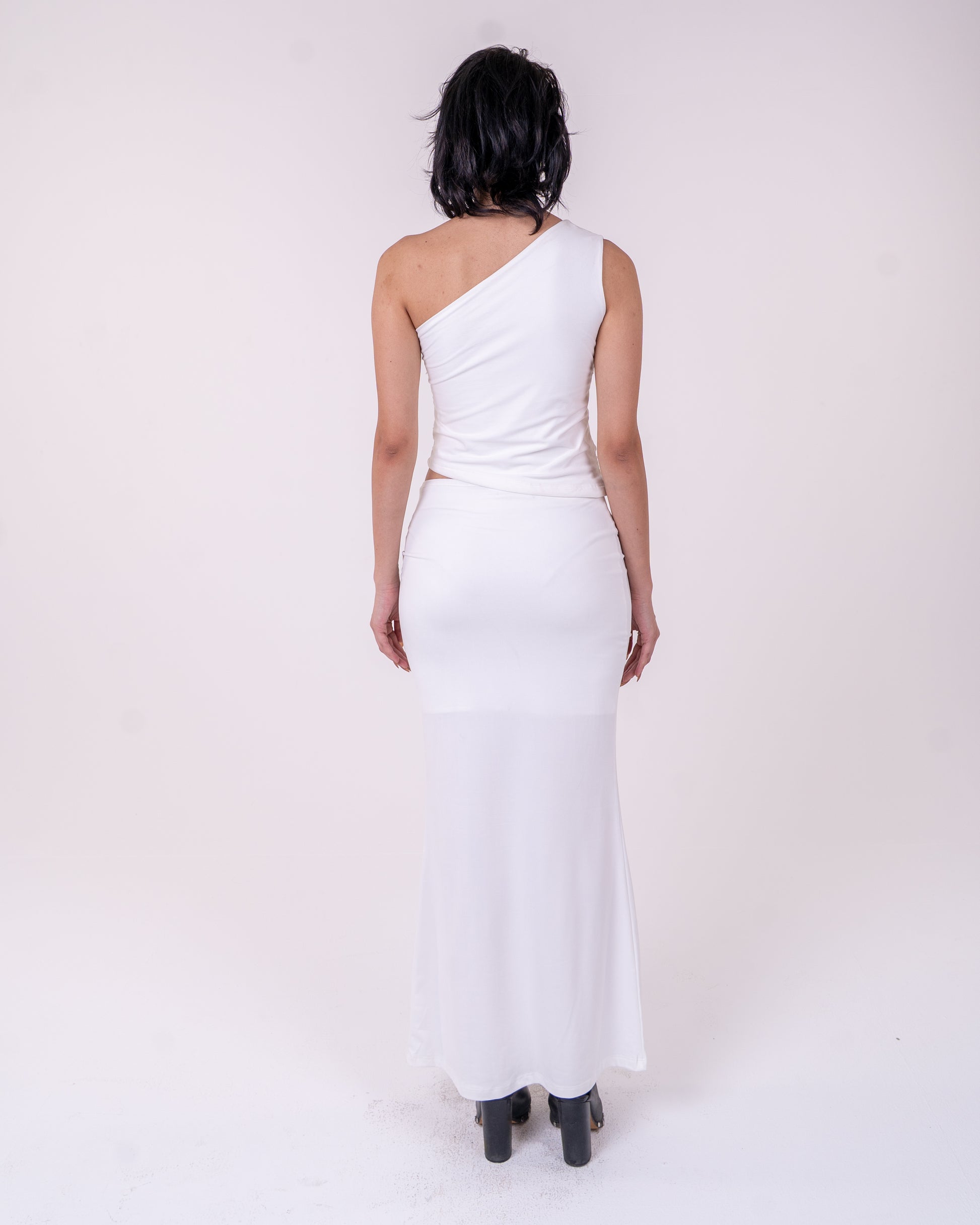 A sleek two-piece set featuring a one-shoulder top and a matching maxi skirt, both crafted with double-layered fabric for a smooth, flattering finish. The top hugs the body with clean lines, while the skirt flows effortlessly for an elegant silhouette. Perfect for summer nights, special occasions, or a bold daytime look.